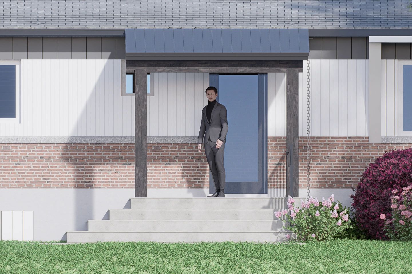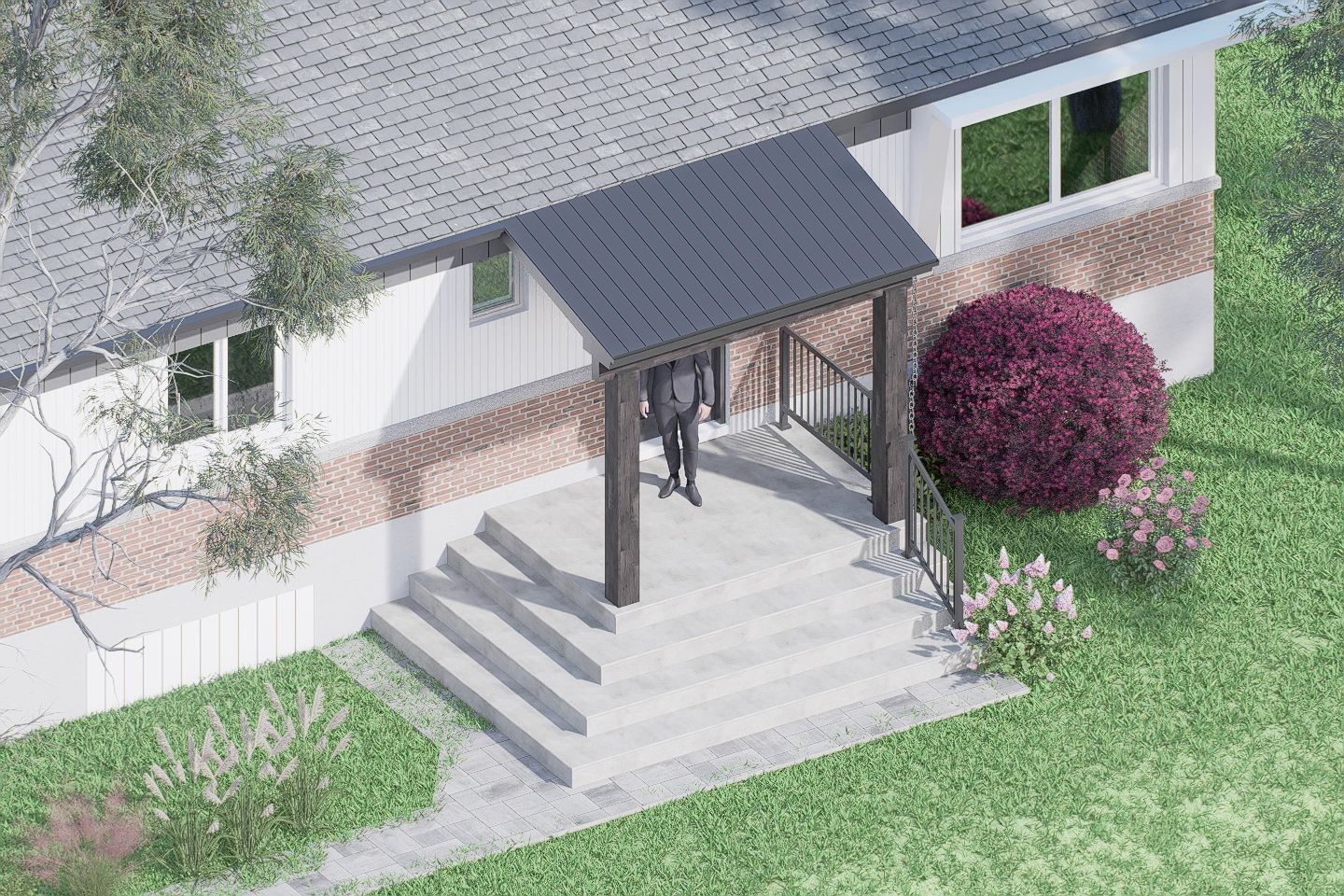 The new design introduces a minimalist canopy in black steel with clean lines, paired with wide concrete steps and a redefined pathway that creates a welcoming transition from street to home.