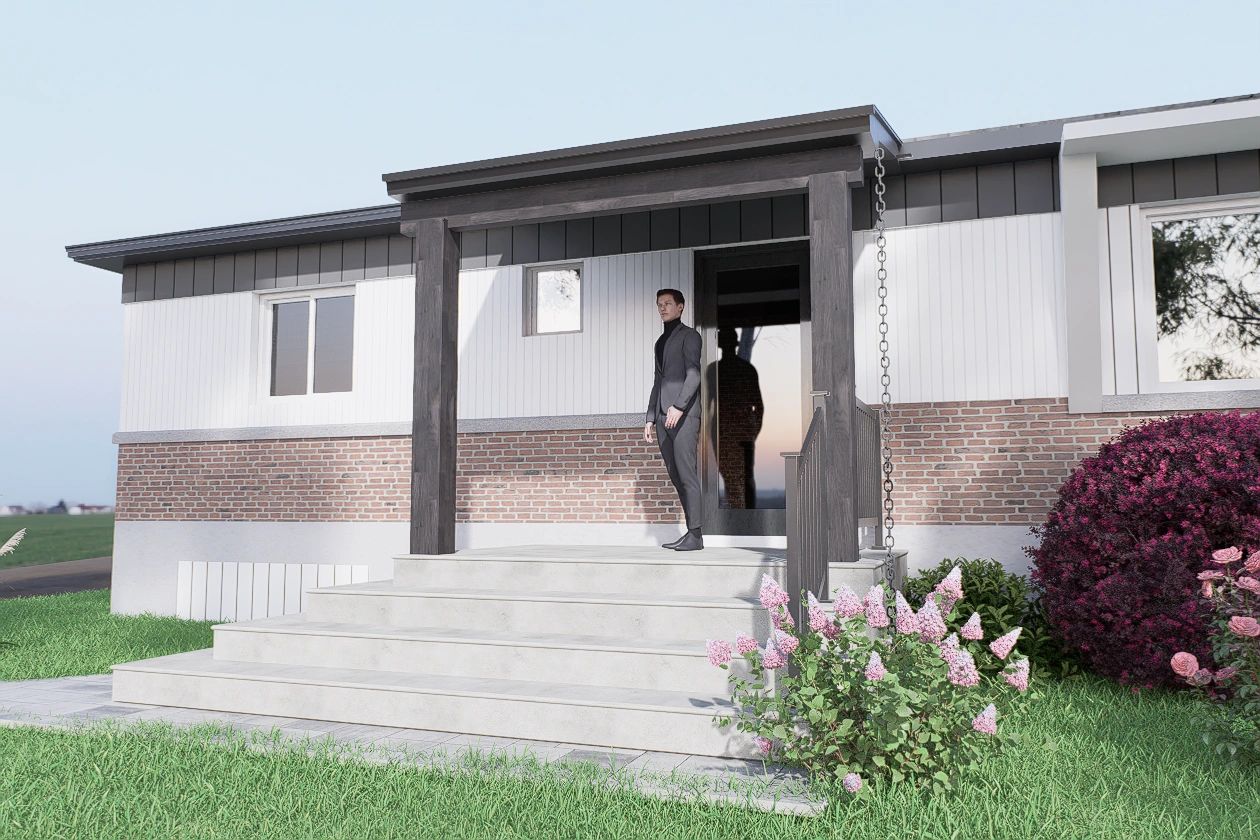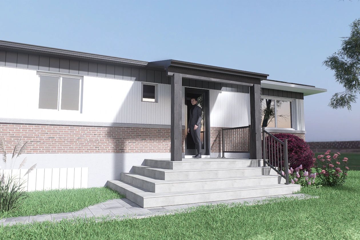 This renovation project reimagines the entrance of a 1960s single-family residence in Laval. The outdated porch, originally enclosed by heavy masonry and a striped awning, was transformed into a light, contemporary entryway that enhances both functionality and curb appeal.