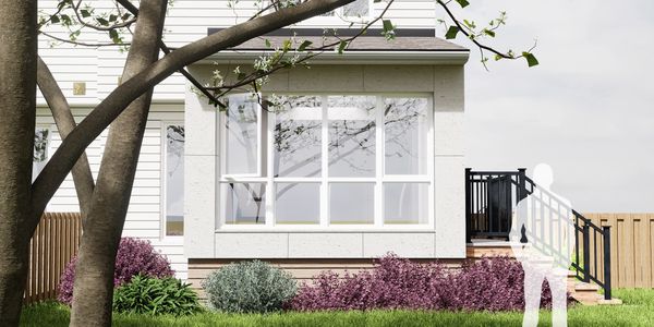 A garage transformed into a cozy, semi-independent living space, complete with a new elevated entrance and roof extension for comfort and privacy.