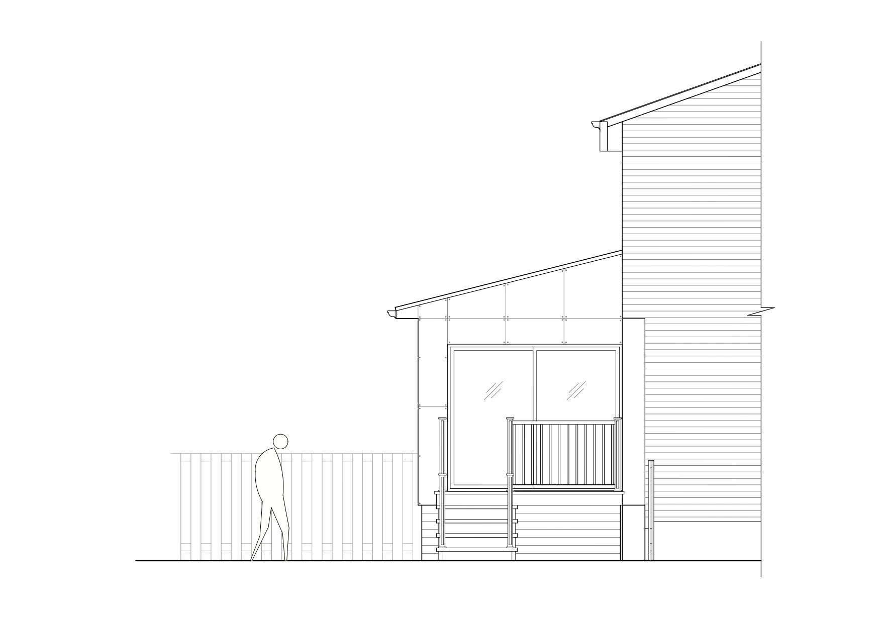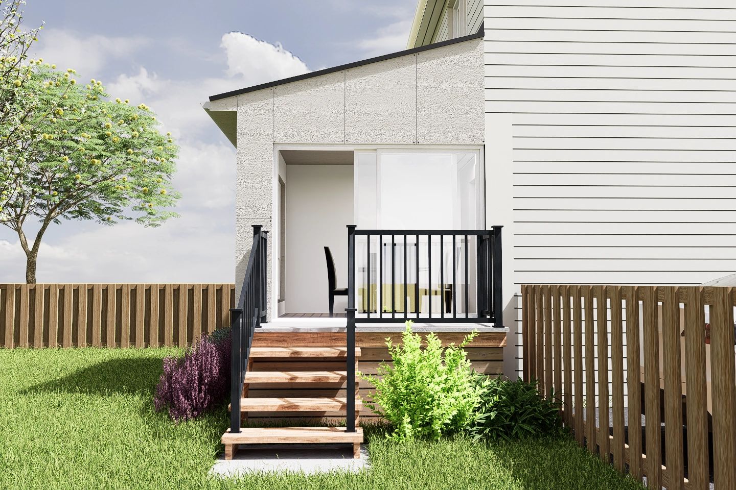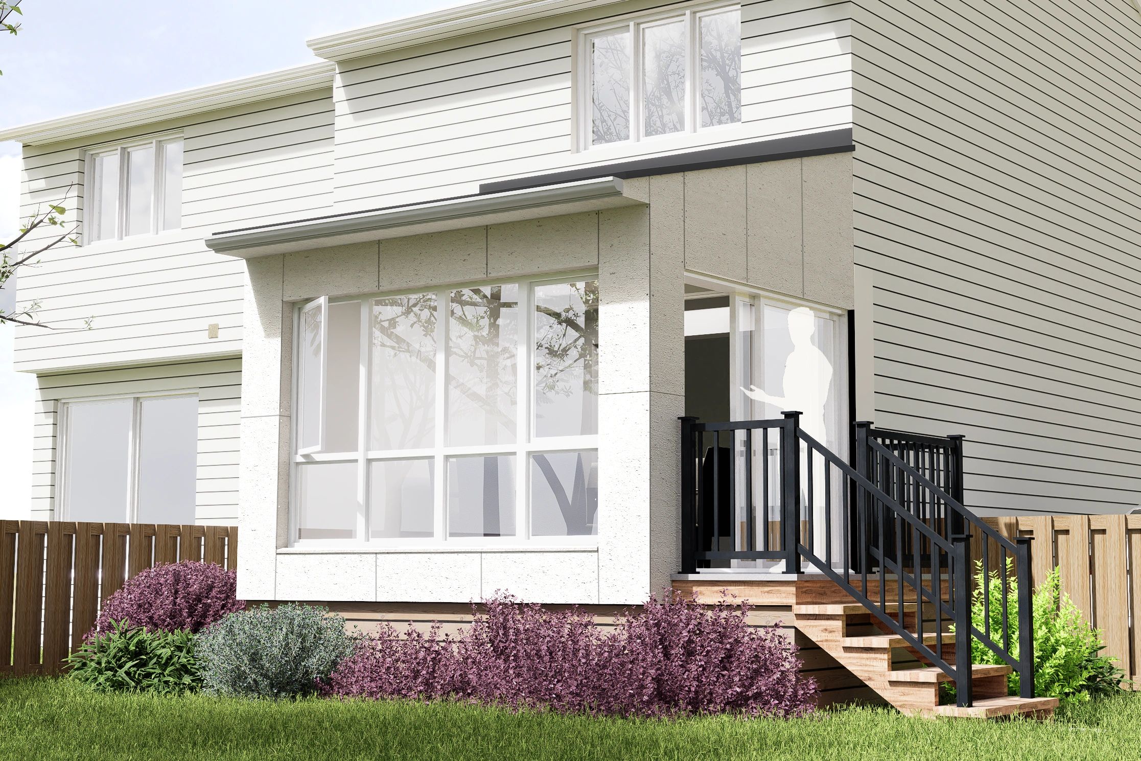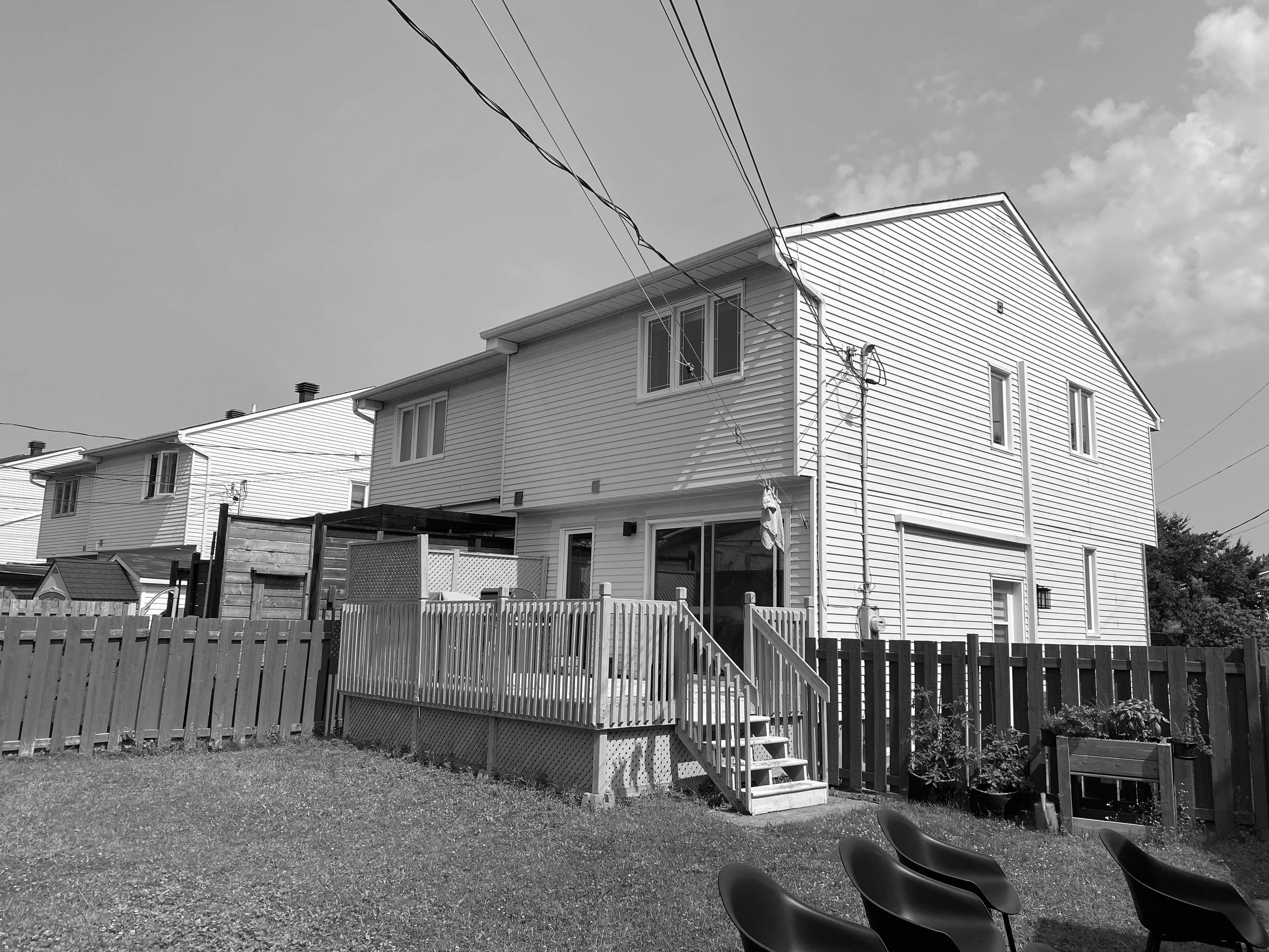 The exterior is clad in fibre-cement panels, complemented by a wooden porch and stair leading to the yard. Our team accompanied the client throughout the process, from permitting with the City of Laval to site supervision.